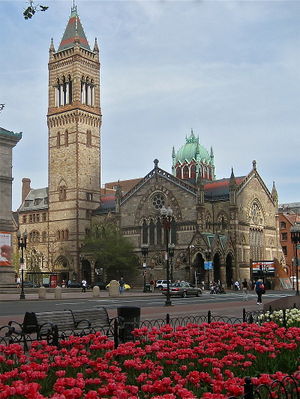 + | Der am westlichen Ende des Gebäudes aufragende Kirchturm ist das wesentliche Merkmal der Kirche und von mehreren Stadtteilen aus sichtbar. Er ist 247 ft (75,17 m) hoch und beherbergt die 2017 Pfund (99,7 kg) schwere Glocke. Es handelt sich bereits um den dritten Turm, der an dieser Stelle errichtet wurde. Der erste wurde 1877 fertiggestellt, kam jedoch seit den späten 1910er Jahren immer mehr in eine Schräglage. Der Grund dafür lag in fehlerhaften Fundamenten und Grundpfeilern, die im weichen, sumpfigen Untergrund verankert wurden und den Turm nicht tragen konnten. Der Turm wurde abgerissen und auf ähnliche Art und Weise neuerrichtet. Dieser zweite Turm wurde bei der großen Melassekatastrophe von 1917 ebenfalls zerstört, so dass man in den späten 1920er Jahre mit Stahlgerüsten einen dauerhaft stabilen dritten Turm errichtete. Heute werden die Neigung und Höhe des Turms regelmäßig gemessen und auf fortwährende Stabilität getestet. | ||